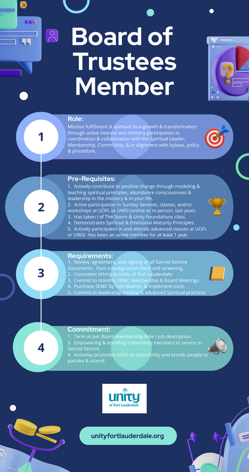 We honor and bless you for considering serving on our Unity of Fort Lauderdale Board of Trustees.  Please review the below requirements, as well as read and review the Board of Trustees Responsibilities & Duties as set forth in our ByLaws.